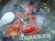 <br/>加入高汤烧开,再加入番茄、黑木耳,烹入少许料酒煮开。</li><li>5
