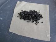 <br/>取一张馄饨皮平铺在案板上,用勺子取适量的混合后的黑芝麻粉放在馄饨皮上。