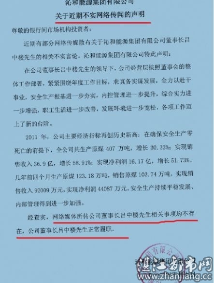 声明称,在董事长吕中楼领导下,公司安全生产根基进一步夯实,内控管理进一步提升,综合实力进一步增强,职工生活进一步改善,发展环境进一步宽松,公司各项工作迈上了新的台阶。2011年,沁和能源集团主要经济指标再创历史新高:在确保安全生产零死亡的前提下,公司全年共生产原煤407万吨,增长30.33%;销售收入36.9亿元,增长58.91%;实现净利润16.17亿,增长51.73%。