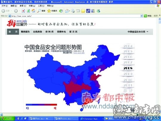 “掷出窗外”网首页是一幅“中国食品安全问题形势图”。