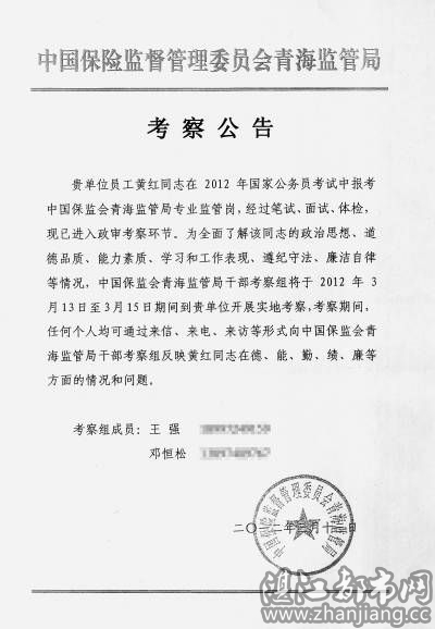 在黄红通过笔试、面试和体检后,2012年3月13日,青海保监局发出对黄红的考察公告。