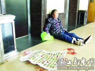 受伤老人坐在电梯口。