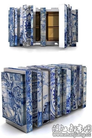 这个餐具柜有个很有分量的名字,叫Heritage。翻译成遗产有点大题小做,可能叫做祖传餐具柜会好一点,但它确实不是什么古物,而是今年最新的家居产品。事实上,第一眼看到它,在还不知道它的用途之前,我以为这是一块漂亮的屏风。它的形状有点手风琴,外形明显得被分隔成一节一节,每一节都讲述一个故事,发生在不同时代不同世纪的故事,又和谐地处于一个截面之上。这些图画都是在葡萄牙历史上不同时期建筑风格的启发下完成的,如果你对此有所了解,可以在上面发现修道院、旧学院的痕迹。当然,不仅是金玉在外,当你打开柜子的时候,会看到里面贴了金箔的柜子,这些同样能提醒你关于之前提到的某些历史,当时的人都喜欢用很多金元素和装饰品。