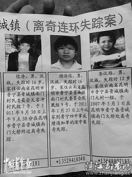 不过上述信息没有得到警方的确认。昆明市公安局新闻发言人办公室表示,公安机关将继续加大工作力度,深入开展案件侦查工作,相关工作结果将适时进行通报。 失踪大学生家属“拼”出连环失踪案 4月25日9时左右,韩耀在晋城镇失踪。正是因为他的家属不断寻访,近年来该地段连续发生的失踪案的碎片才被一点点拼凑起来。 韩耀的母亲成联艳说,19岁的韩耀今年即将从云南省工商管理学校毕业,4月中旬进入一家工程勘探公司实习,被分派到距离昆明市区40余公里的晋宁县晋城镇一处工地上班。 当天7时,韩耀上了工地,8时30分左右,一名经理安排他回公司取两份文件,但直到10时许韩耀仍没有返回工地,手机已经关机。 有同事证实,韩耀9时许回到公司取了文件,并从后门出去了。当天中午,公司同事开始在附近寻找,但没有发现任何线索。第二天一早,成联艳从昆明赶到晋城,并报了案。 “他不是调皮捣蛋的那种孩子,他很听话。这是他的第一份工作,他很感兴趣,曾经对我说要好好工作。我不相信他会离家出走。”5月9日下午,成联艳哭泣着对记者说,当时她尚不知道韩耀已被确认遇害。 韩耀失踪后,他的家属印制了许多照片,分头在晋城镇大街小巷寻访打听。一位老人告诉他们,这几年附近已经发生过多起失踪案件,丢失的孩子都没有找到。 接下来的几天,韩耀的家人连续走访了多个失踪孩子的家庭,将信息汇总以后,惊讶地发现,失踪的都是男孩,多为12至20岁,此前都没有表现出异常或离家出走的征兆,失踪的范围不超过1公里,时间多为上午。 当年12岁的李汉雄是目前所知最早失踪的孩子。2007年5月1日一大早,李汉雄随父母下地干活,9时30分左右回家做饭。因为李汉雄前一天将一件外套落在了家中的另一块田里,便先去取外套,从此再也没有回来。 他的父亲李玉东说,家中的那块地离得比较远,要穿过新公路,儿子很可能是在公路边被掳走了。全家为了找儿子,一年就花光了结婚后存下的七八万元。 记者与李玉东站在路边交谈的时候,这位近一米八个头的汉子突然直挺挺地往后栽倒,后脑勺重重地砸在地上。旁人扶起他坐下缓了一阵,他才说,这几天精神压力太大,一直没有休息好,刚才突然感到眩晕。 去年1月27日上午,16岁的谢海俊到晋宁四中取期末成绩单后失踪。那个春节,谢家没有在家过年,发动了亲戚朋友到周边县市寻找,花了四五万元却没有一点线索。 记者搜集到的信息还有,17岁的采云伟今年2月19日10时左右失踪,16岁的陈涛于去年9月30日9时30分失踪,另外3名失踪少年胡兴越、刘熙和张聪林都不是当地人,记者无法联系上他们的家属。其中,采云伟、胡兴越和刘熙都是鑫云冷库的员工,据称都是在上下班途中失踪的。 家属曾怀疑失踪少年被黑砖窑掳去做苦工 中国青年报记者在失踪案频发的地段走访发现,这里是214省道的一段,鑫云冷库位于道路一旁。与214省道交会的两条土路上尘土飞扬,一侧有一片小树林。这里车流量很大,但行人较少。 家长们说,曾有传言说有人专在该路段伺机“偷人”,一旦瞄准单身青壮年,便有摩托车或面包车从背后驶来掳上便走。不过他们并没有找到过目击者。在张永明被抓获之前,他们的怀疑对象一是黑砖窑,二是器官贩子,三是传销组织。 就在韩耀失踪的当天,被黑砖窑掳走、过了18天非人生活的广西壮族自治区博白县青年雷玉生幸运地逃了出来。由于雷玉生被掳走的地点呈贡区马金铺离晋城镇只有12公里左右,经过当地媒体的报道,人们便自然而然地将晋城镇少年连环失踪案与黑砖窑联系起来。 24岁的雷玉生在一家酒曲厂打工。4月7日傍晚,他吃过晚饭去街上理发,走在路上突然背后驶来一辆面包车,他还没有反应过来,就被人拉进了车里。 “车里两个人,一个开车,一个抓人。我一上车就被抢走了手机,身上6元钱也被没收了。那人用拳头捶我的肩膀,我不敢反抗,也什么都不敢问。”雷玉生回忆,车子开了很久,才到一处厂房,他被丢进房间里反锁起来。 第二天,雷玉生才发现,这是一个砖厂,他和另外31个工人被强迫脱坯、出窑,身高只有1.4米的雷玉生搬砖装车,每天的工作时间是从凌晨2时到中午12时,“一刻不停地做工,稍微懒一点就被看守用铲子和粗棒打。”雷玉生说,他的腰背被打得至今还痛。有一回,一个工人干活时说话,监工操起一块砖头就打他的头;另一回,雷玉生被监工掐住脖子,窒息晕倒了一个小时。 干活时没有水喝,一天两餐,中午收工后一顿,半夜上工前一顿。“一般是米汤、白菜汤,或者一小碗面条,从来没吃过肉,从来没有吃饱过。” “我们相互不能说话。不能洗脸洗澡,头发都长长的,脸上又脏又黑,看不出年龄。”雷玉生说,每间房4张1.2米宽的床,每床睡两个人,睡觉时有人在门口守着。一直到逃出来,他都不知道与自己同床的工人姓甚名谁,来自何方。 4月25日中午,趁看大门的人离开岗位,他鼓足勇气冲出了大门,不知道跑了多远,才找到一个小卖部,给酒曲厂拨了电话。 酒曲厂老板赖祥南说,后来才知道,雷玉生被掳到了100多公里外陆良县的一家砖厂,不识字、听不懂普通话的他成功逃出,又自己坐车回到昆明实在是个奇迹。他回来的时候全身黑臭,头发盖过了耳朵,精神状态很糟糕,容易受惊,到现在还不敢单独走出酒曲厂的大门。 失踪少年谢海俊的父亲谢顺生说,晋宁县、澄江县和江川县这一带砖厂很多,当地人都听过砖厂“