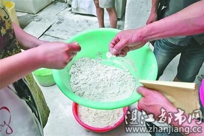 11日,在匡山新村幼儿园西侧的一家米线加工作坊内,执法人员发现一个盆内盛着白色的粉状物,其中还有不少结块。 记者李鹏飞 摄