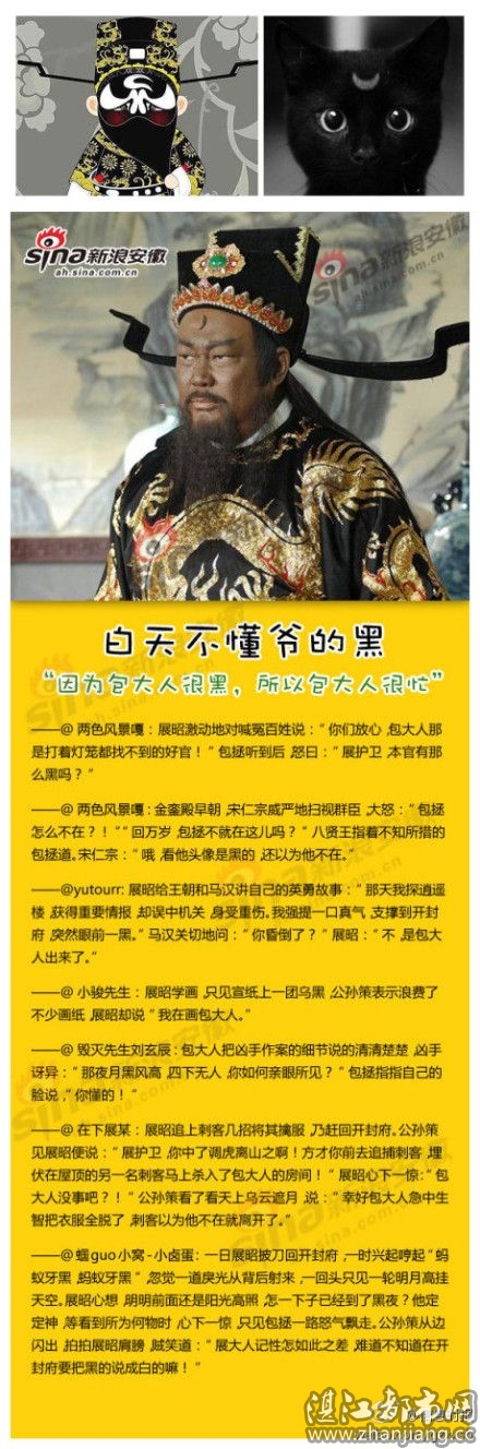 展昭给王朝和马汉讲自己的英勇故事:“那天我探逍遥楼,获得重要情报,却误中机关,身受重伤。我强提一口真气,支撑到开封府,突然眼前一黑。”马汉关切的问:“你昏倒了?”展昭:“不,是包大人出来了。”