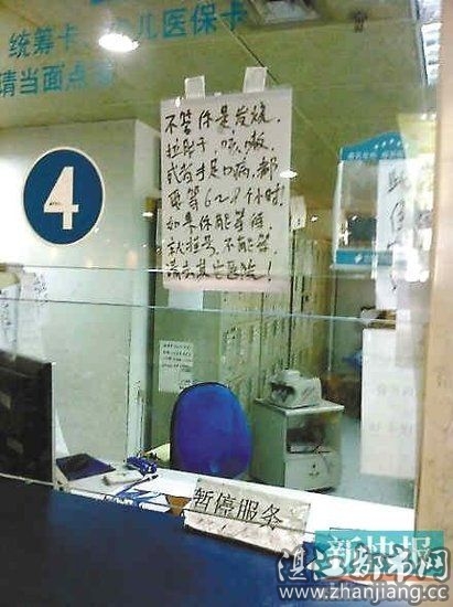 “不管你是发烧,拉肚子,咳嗽,或者是手足口病,都要等6~8个小时!如果你能等待,就挂号。不能等,请去其它医院!”新快报记者从“Rains小雨”的微博附图看到这段话,在该挂号窗口底下还放了“暂停服务”的小牌子。不少微博网友对其群起而攻之,网友们纷纷称“医院够霸气”。截至记者昨日发稿时止,该微博转发数达到1501次。