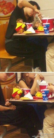 这组热门图片由2张组成,据观察应出自手机拍摄,摄下了一只比肯德基可乐杯大不了多少的金毛小猴站在肯德基餐饮区桌面上,捧着麦管,吸食杯中可乐的有趣景象。根据照片可以看出,小猴由主人一家亲友至少3人陪伴,从它身着黄红相间的小连帽衫及“登堂上桌”的方面看来,深得主人宠爱。