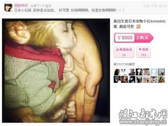 照片一度疯传,许多网友发帖询问这是什么猴子,如此可爱?据知情网友介绍,这种猴名为“石猴”,系国家唯一允许个人饲养的宠物猴,但必须在合法商贩处购买。“购买时卖家会附赠一张饲养许可证,石猴需接受每年一次的防疫检验,但是价钱很贵”。