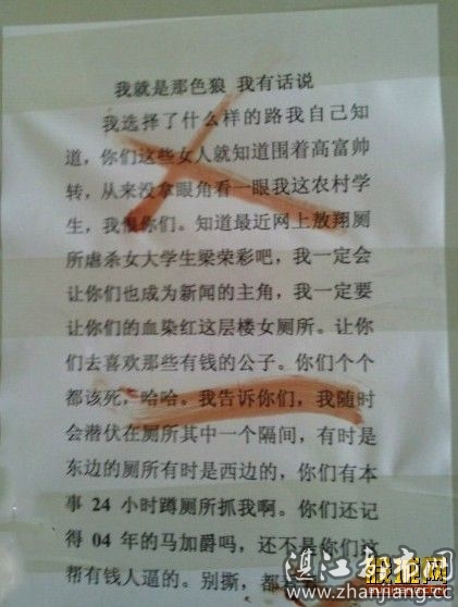 偷窥男女厕留血书 男子写“血书”自称色狼 欲报复女生