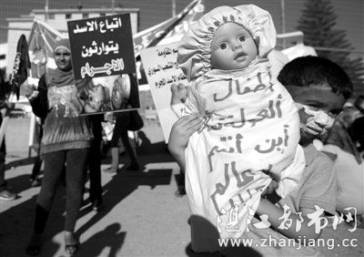 9日,以色列阿拉伯人举着写有“胡拉的孩子”字样的洋娃娃参加游行,要求巴沙尔下台,以解决叙利亚危机。