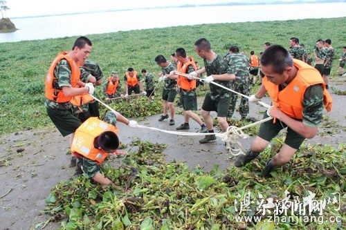 8日下午,武警湛江市支队100余名官兵主动请缨,携带各种打捞工具,冒着烈日高温天气赶往鹤地水库,协助水库管理部门清理打捞湖面上的水浮莲。经过12小时的奋战,官兵们清理打捞了近12亩约110吨的水浮莲,有效遏止水浮莲生长蔓延和对水质的深度污染。
