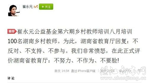 当天,崔永元参加以“乡村教师培训公益活动”为主题的微博访谈,访谈开始前,他在微博中写道:“崔永元公益基金第六期乡村教师培训八月培训100名湖南乡村教师。为此,湖南省教育厅回复:不反对、不支持、不参与。我们非常愤怒,在此正式评价湖南省教育厅:不努力、不作为、不要脸!”