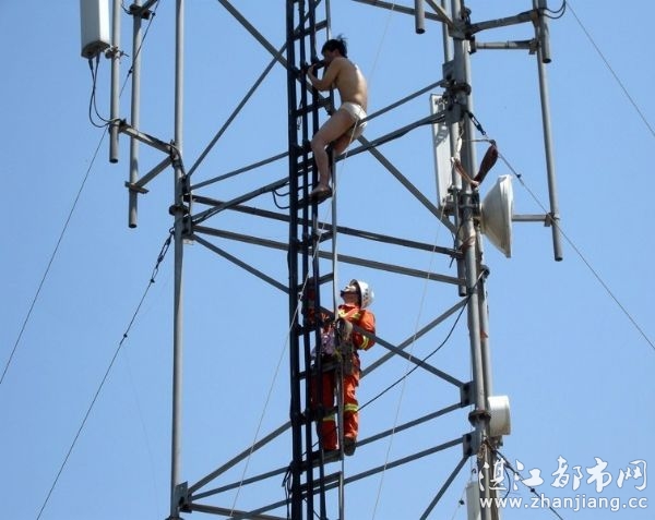6月11日,太原一男子半裸着爬在南内环汾河公园的一处信号塔上,该男子系长治市武乡人,几年前修了武乡县山司乡8.5公里的路,讨要工资却得不到解决,来太原几天四处讨说法未果后,才出此下策。