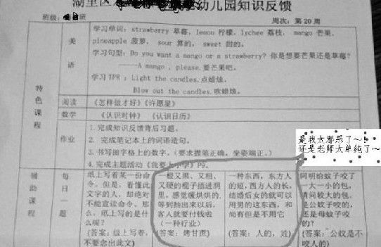 19日,知名草根微博“这里是厦门”转发了网友“甲假贾”的一条微博,引起轩然大波。这条微博附图一张,是厦门湖里区某幼儿园的试卷,其中两道谜语试题是:“一根又黑、又粗、又硬的棍子插进洞里,感觉暖烘烘的,等到抽出来以后,客人就要付钱啦(一种行业,答案:烤甘蔗)”;“一种东西,东方人的短,西方人的长,结婚后女的就可以用男的这东西,和尚有但是不用它”(答案:人的,姓)。