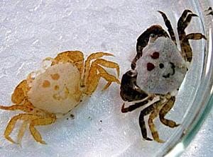 <br> 日本鸟羽市水族馆一只壳上长有人脸图纹的螃蟹趴在它刚刚蜕下的壳边。这只奇特的螃蟹是一名八岁男孩在海边捉到后交给水族馆的。 <br> <br> <br>