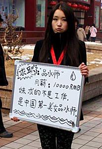 <br> 一位求职女孩在王府井大街上举牌找工作,牌上写道:“求职:品水师,月薪:10000RMB,妹求的不是工作,是中国第一美女品水师。” 当路人问道,为何用这种方式找工作?女孩说自己是在国外学习品水的知识,回国之后想找一份品水师的工作,可是一直没有企业需要。万般无奈之下,希望用这样的方式来试一试,希望能引起关注帮她早日找到工作,也想让大家对品水师这个新兴职业多些了解。女孩当场还为路人介绍很多关于水的知识:意思就是说天然矿泉水才是最健康的饮用水,少喝纯净水。现场还有好几个老外,也问了很多问题,女孩很耐心的解答。<br> <br> <br>