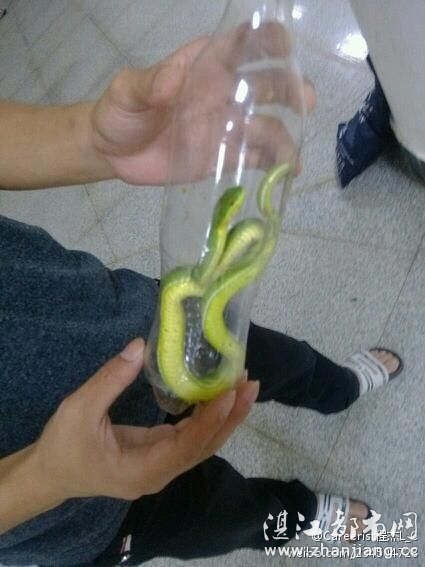 @Careerist程杰L_C : 【毒蛇潜伏在图书馆旁边草坪】不知道怎么的就上去踩一脚,结果没踩死它又溜走,于是找块砖头拍一下,当场就被砖头压着不动,然后两人找个瓶子装起来,回去查了才知道这蛇叫竹叶青,有毒的,建议各位同学晚上路过图书馆的草坪要小心了,希望都能顺利毕业…