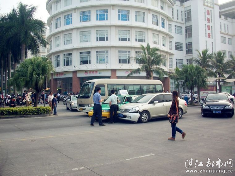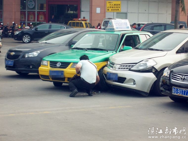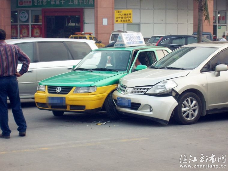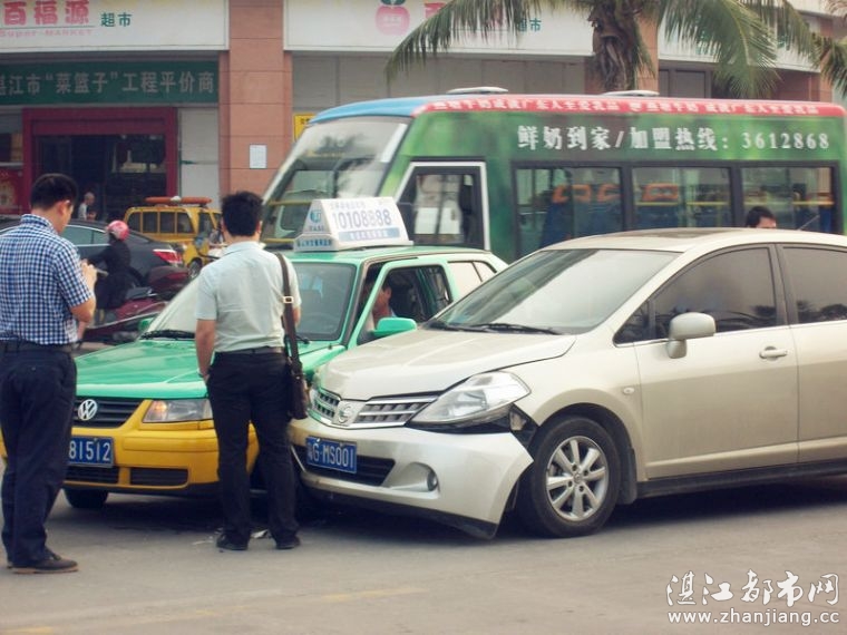 湛江都市网网讯(图片/梁延胜 编辑/梁延胜)早晨8点钟,于绿华路段锦绣银座旁发生了一起交通意外;一架绿色的士的左轮胎被小轿车头部碰到。小轿车头部损伤比较严重,而的士的轮胎就被撞歪了。事故具体原因正在调查中。