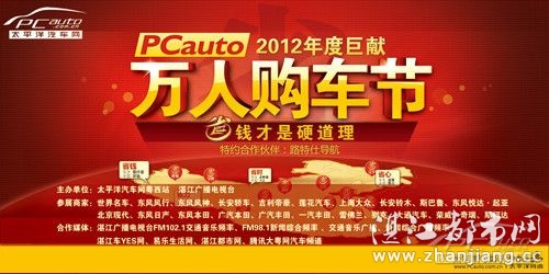 第二届2012太平洋汽车网粤西站万人购车节将于12月7-9日在湛江市体育中心隆重开幕。此次万人购车节是由太平洋汽车网联动全国72个分站举办的大型车展团购会,本届万人购车节尊循"省时、省力、省钱、省心"的购车理念,着力为广大消费者带去了优惠的价格、优质的服务。