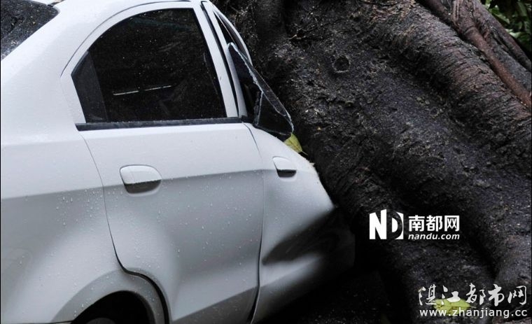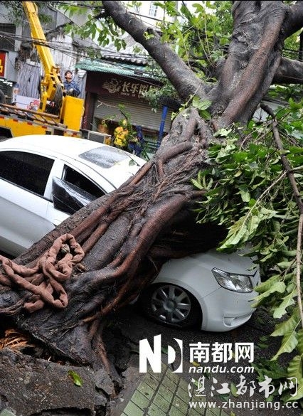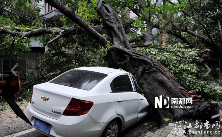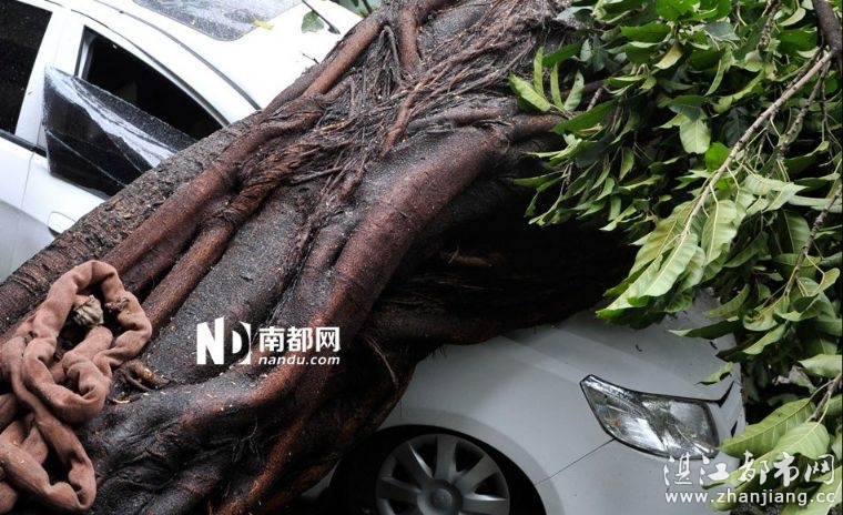 继上周广州越秀区钱路头直街一棵百年老树倒塌后,昨日老城区又有大树倒下。昨日(11月3日)上午7时40分左右,越秀区海珠中路一棵至少有50年树龄的大叶榕不支倾斜,牵扯到相邻的另一棵大叶榕,两树双双倒下,树下两辆小汽车难逃一劫,街对面的阳台也遭了殃。