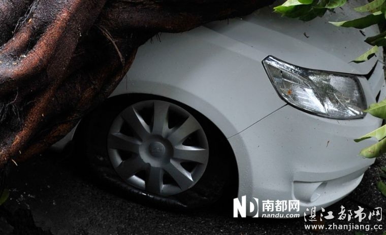 两棵倒下的大叶榕树根将人行道上的地砖翘起了将近30厘米。两辆停在树下的小轿车难逃一劫。方先生告诉南都记者,其中一辆小车损伤不大,车主很快将车开走维修。另一辆小车则被压扁,难以移动。