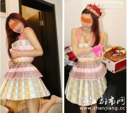 微博附有两张照片,照片中,一名妙龄女子身着一件用“钞票”做成的礼服,分别做出站立和跪着的姿势,满脸笑容,但眼睛部位打了马赛克。该微博在网上迅速走红。