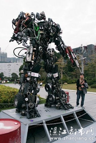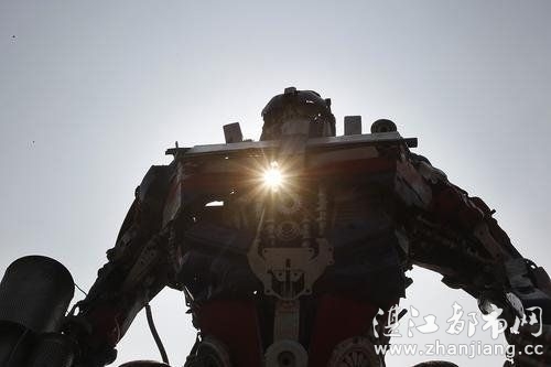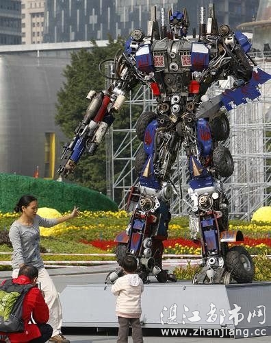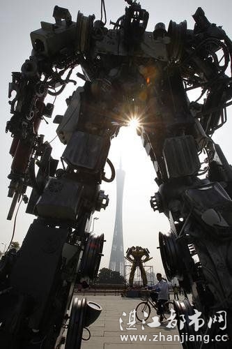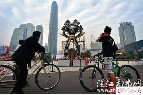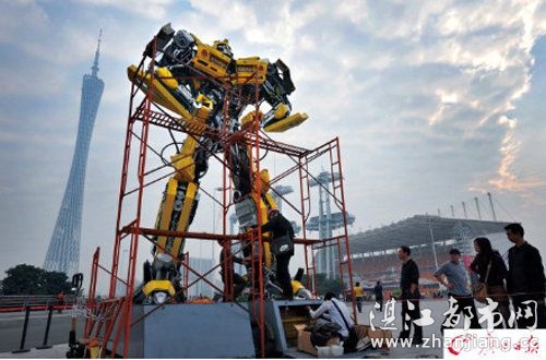 原来一年一度的广州国际灯光节即将开幕,一群变形金刚前来助兴。工作人员正在给机器人上的灯光做最后的调试,15日晚,市民们将可以一饱眼福。