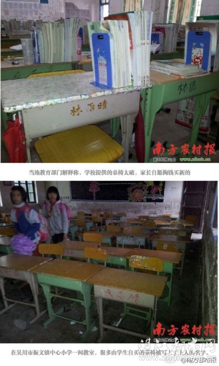 振文镇中心小学校长梁燕忠告诉南方农村报记者,之所以要学生自买课桌,主要因为义务教育经费紧张,学校无力购买新桌椅,“我们共有1200多名学生,但学校最多只能提供500张破旧的桌椅。其中有些烂的,只能卖给村民烧柴用。”