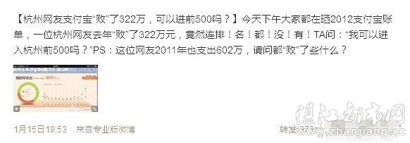 大家都在晒2012支付宝账单,一位杭州网友去年“败”了322万元,竟然连排!名!都!没!有!TA问:“我可以进入杭州前500吗?” PS:这位网友2011年也支出602万,请问都“败”了些什么?