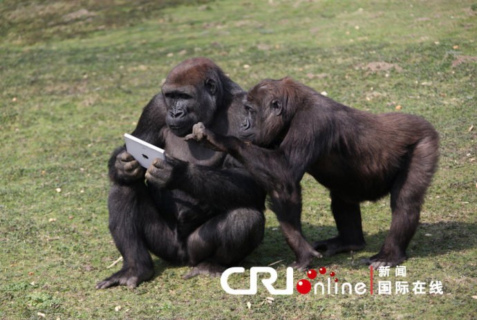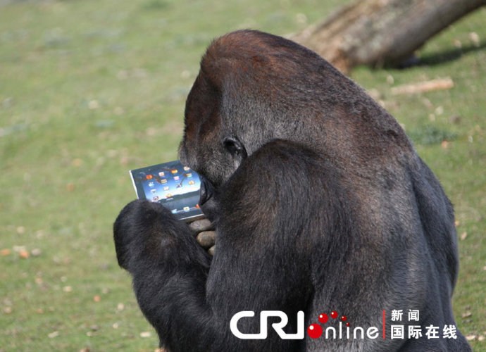 英国肯特动物园的大猩猩拿着新上市的iPad2平板电脑,好像在研究它的功能。