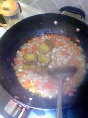 往锅里倒入油,大火将丁丁都倒入翻炒,然后倒入水煮沸。</li> <li>3