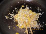 锅中倒入适量油,烧热后,将虾皮稍炸一下,然后直接将打好的蛋液倒入翻炒(炒鸡蛋),关火后倒入剁碎的粉丝。</li> </ul> <ul><li>4