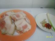 锅内做水煮开,放入五花肉略焯去除血沫(我用的已经焯过了,是家里的存货)。五花肉切成薄片、葱蒜切段,姜切片、干辣椒切段。</li> <li>2