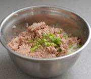 将土豆压成泥,加入滤干水份的吞拿鱼、葱、黄油和适量黑胡椒粉。鱼本身带有咸味,意式面包粉也是咸的,所以不用加盐了。</li> <li>3