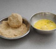 鱼饼先蘸上蛋液,再滚上面包粉。</li> <li>6