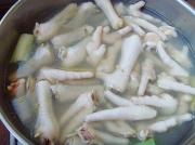 锅中水烧开,加葱段、姜片、料酒,放入鸡爪煮至断生。(时间不宜过长5-8分钟即可)</li> <li>9