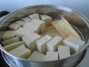 将豆腐块依次放在一个铺有干净玉米叶或稻草的蒸锅,(使用纸箱、竹筛也可)。块与块之间要有空隙。豆腐需要放多层的、上下两层之间需要有空隙。</li> <li>3