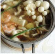 锅里加高汤放入菇类与海鲜最后再加乌龙面煮到熟.撒上葱花。</li> </ul>