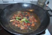 再将肉倒回锅中,加入料酒、老抽和生抽炒上色。</li> <li>9