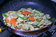 然后下入豆丝翻炒,加入两勺盐、少量水炒匀,然后不停翻炒至豆丝表皮有些许带焦。</li> <li>8