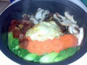 再10分钟后,闻到浓郁的腊味香时,将香菇,青菜,胡萝卜平铺在最上层,然后将炒好的酱汁沿着锅四周倒入。</li> <li>9