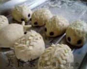 做造型哦,就是在一块面团上剪出“刺猬”上面的“刺”,再用黑豆做“刺猬”的眼睛哦。</li> <li>6