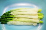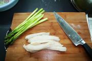把竹荪泡开,去掉底部和头部,过热水煮一下。芦笋洗净,去掉表面老皮,烧开热水,放入少量盐和油,放入芦笋焯一下,取出,过凉水备用。</li> <li>2