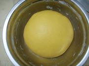 剩下的白糖放碗里,倒进3汤匙开水,把糖化开,等水凉至35度左右,把酵母倒进水里化开.取一大盆,把面粉倒入,南瓜泥倒进中间把酵母水淋在面粉上,然后把所有材料用筷子拌匀.</li> <li>3