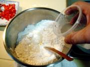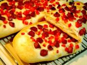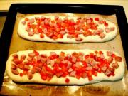 把坯料放入烤盘,再撒上红甜椒粒,用手轻按,也使之粘牢。</li> </ul> <ul><li>19