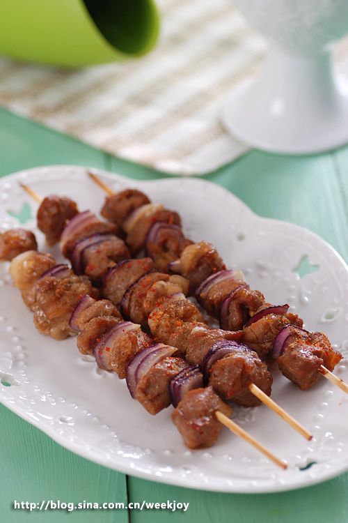 2.腌好的肉用竹签串起,中间隔洋葱一起串,刷一层油,放入乐葵料理碗中,烤箱预热200度,烤15分钟后取出撒孜然粉和辣椒粉继续烤5分钟即可。