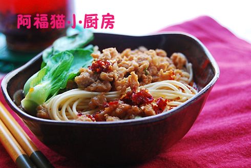材料:龙须面,肉末,青菜心,草果、大料、桂皮,生抽