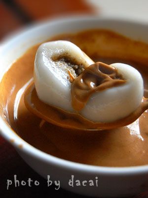 6, <wbr> 将适量白糖、麻酱加水调成麻酱小碟,汤圆蘸取适量麻酱食用。