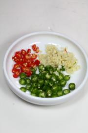 将青椒,小米辣切小圈,蒜切粒。</li> <li>9